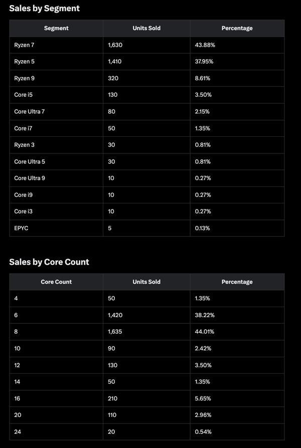 具体型号方面,AMD的锐龙7 9800X3D和7800X3D(均为8核)受到玩家的青睐,分别售出了740颗和250颗,6核的锐龙5 7600X3D也取得了不错的销售成绩,周内售出了680颗。