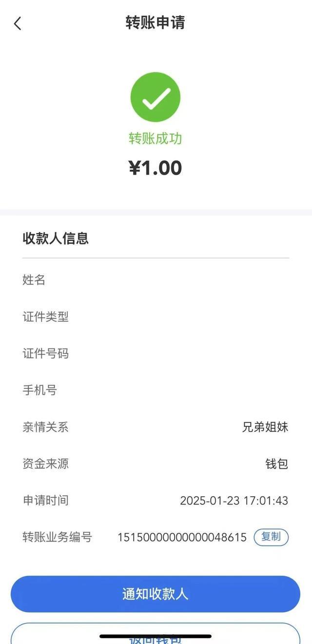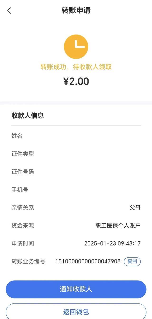 ■在钱包前面界面,点击医保钱包转账申请,填写被转账人基本信息,填写完成之后,点击提交,等待返回信息: