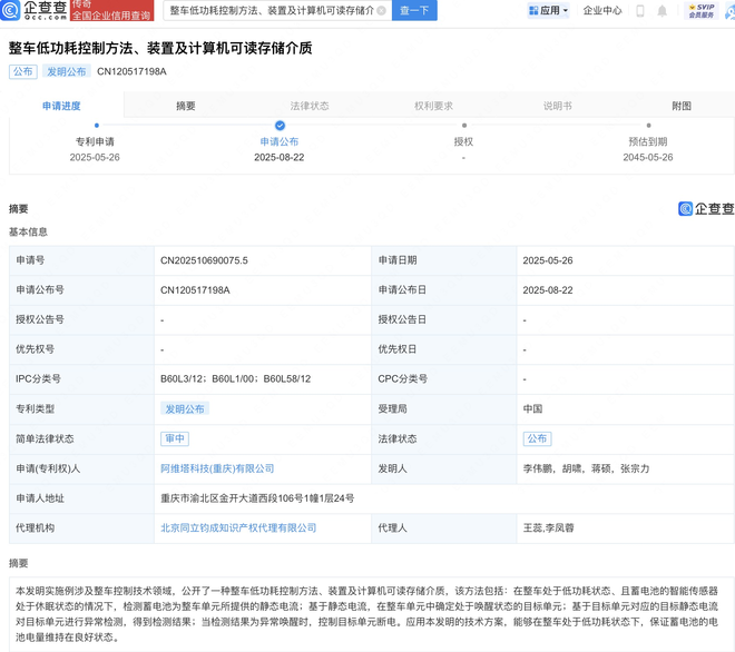据企查查APP显示,近日,阿维塔科技(重庆)有限公司“整车低功耗控制方法、装置及计算机可读存储介质”专利公布。企查查专利摘要显示,本发明实施例涉及整车控制技术领域。该方法包括:在整车处于低功耗状态、且蓄电池的智能传感器处于休眠状态的情况下,检测蓄电池为整车单元所提供的静态电流;基于静态电流,在整车单元中确定处于唤醒状态的目标单元;基于目标单元对应的目标静态电流对目标单元进行异常检测,得到检测结果;当检测结果为异常唤醒时,控制目标单元断电。应用本发明的技术方案,能够在整车处于低功耗状态下,保证蓄电池的电池电量维持在良好状态。