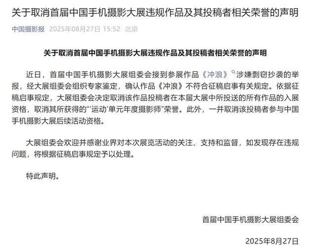 8月27日,首届中国手机摄影大展组委会发布《关于取消首届中国手机摄影大展违规作品及其投稿者相关荣誉的声明》:取消参展作品《冲浪》所获得的“‘运动’单元年度摄影师”荣誉,并一并取消该投稿者参与中国手机摄影大展后续活动资格。