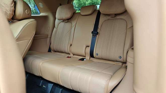 第三排座椅也不再是“小板凳”,现在支持四向电动调节,舒适度大大提高。三个座位均配备坐垫+靠背区域座椅加热,以及新增左右座位的座椅通风,220V车内电源等功能。