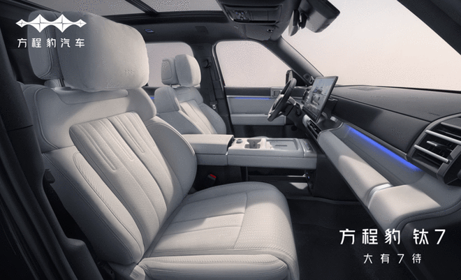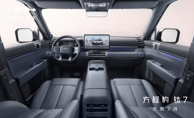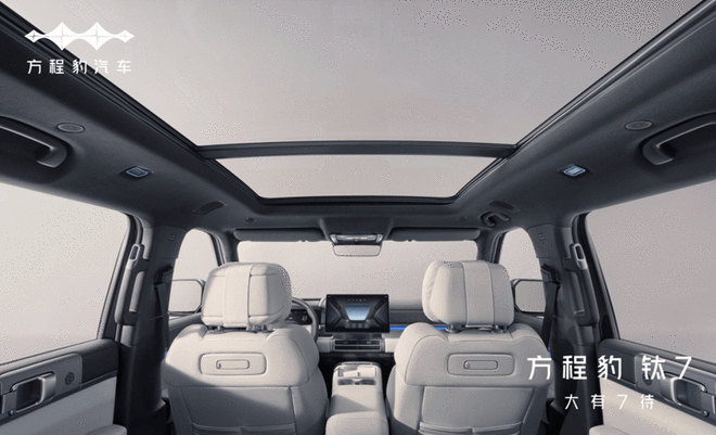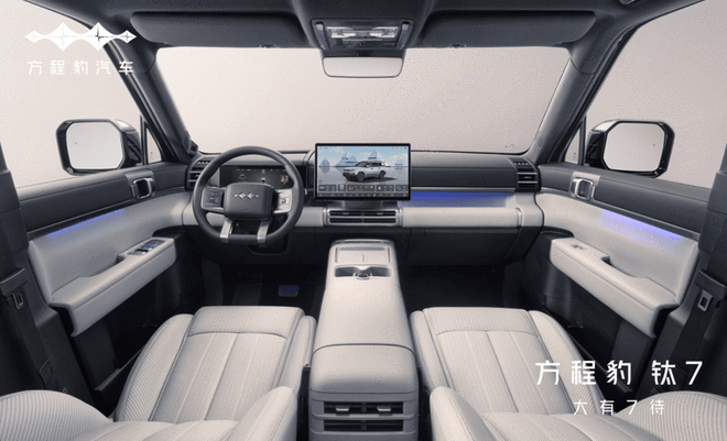 在内装方面,钛7采用了独特的星际方舟设计语言,将 “方” 与 “圆”进行融合。“方”的风格更多的去营造空间感以及硬核的定位,而“圆” 形包边设计则让内装风格更有温馨体验,为家庭出行增添暖意。另外,双层环绕悬浮式设计的运用,进一步延伸了车内视野的开阔感,使其成为目前方程豹产品中设计最时尚、最适合家用的车型。在内饰色彩选择上,钛7推出了雪隐灰、日蚀蓝和暮云橙三款配色。