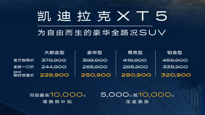 8月30日报道在8月29日晚间的“2025秋季艺术大赏庆典”上,新款凯迪拉克XT5(参数丨图片)正式上市,此次共推出4款车型,其中也包括豪华满配的大都会版,官方指导价37.99万-45.99万,全款一口价24.49万-33.59万,周年庆限时惊喜价22.99万-32.09万元,当然,全系车型可享重磅周年庆限时权益,包括同级最高10000元增换购补贴,与5000元定金抵扣10000元车款。历经四代车型迭代的凯迪拉克XT5已经赢得全球超150万用户的选择,此次上市的新车除了价格和权益充满惊喜之外,还增加赛里木蓝的新配色,动力依旧是采用2.0T发动机+48V轻混系统的组合。同时,倪妮也正式官宣成为凯迪拉克品牌代言人。