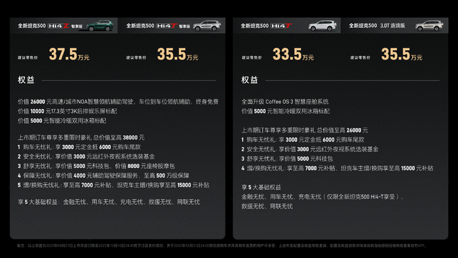 8月29日报道 在正在举行的2025成都车展上,全新坦克500(参数丨图片)正式亮相。新车在8月27日于都江堰正式上市,两小时大定突破1.2万台。其中共推出四个版本:Hi4-Z智享版37.5万元,Hi4-T智享版35.5万元,Hi4-T基础版33.5万元,3.0T造境版35.5万元。