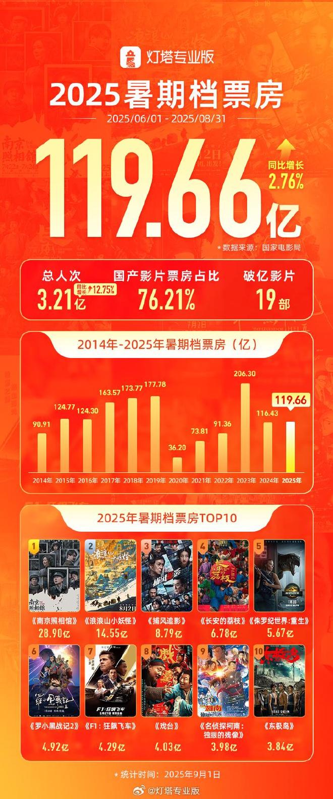 根据国家电影局统计,2025年暑期档票房119.66亿,同比增长2.76%,《南京照相馆》以28.9亿票房成为2025暑期档票房冠军。