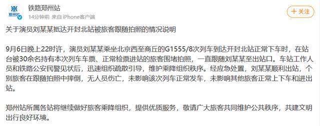 今天下午,@铁路郑州站 微博发布关于演员刘某某抵达开封北站被旅客跟随拍照的情况说明,具体如下: