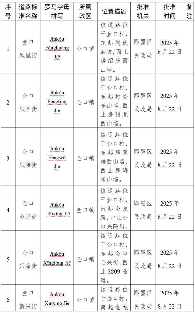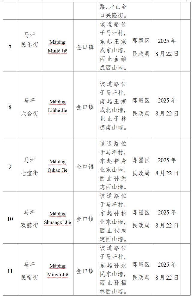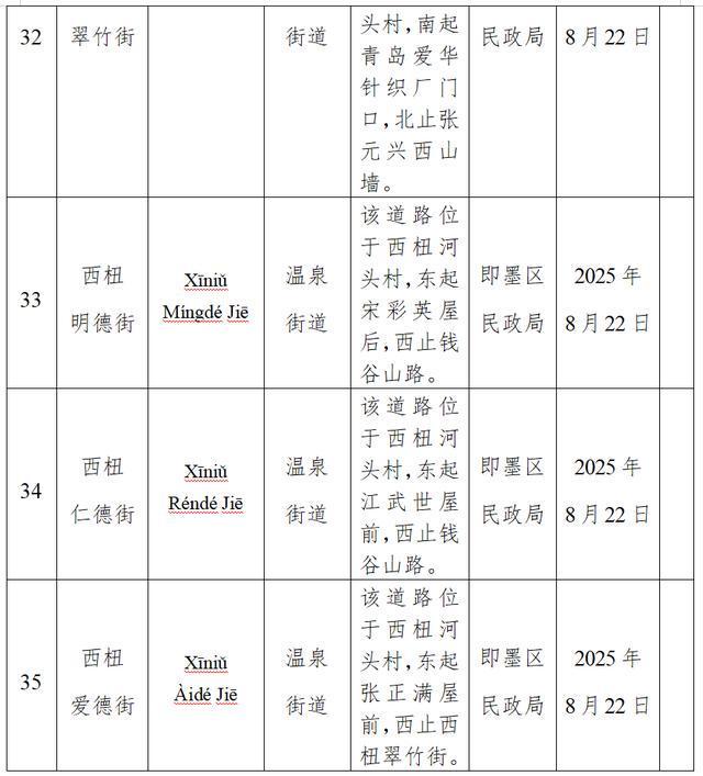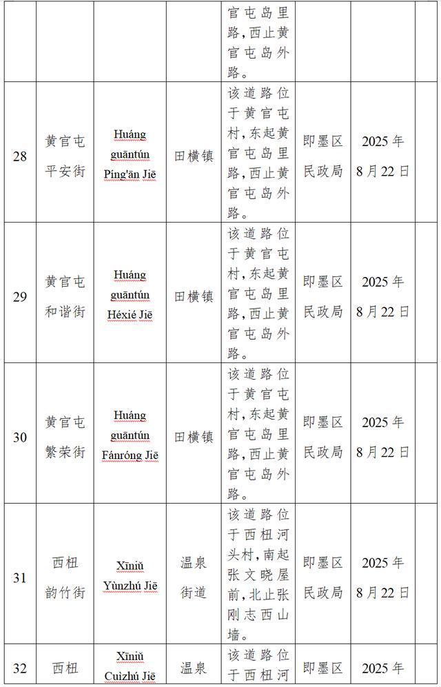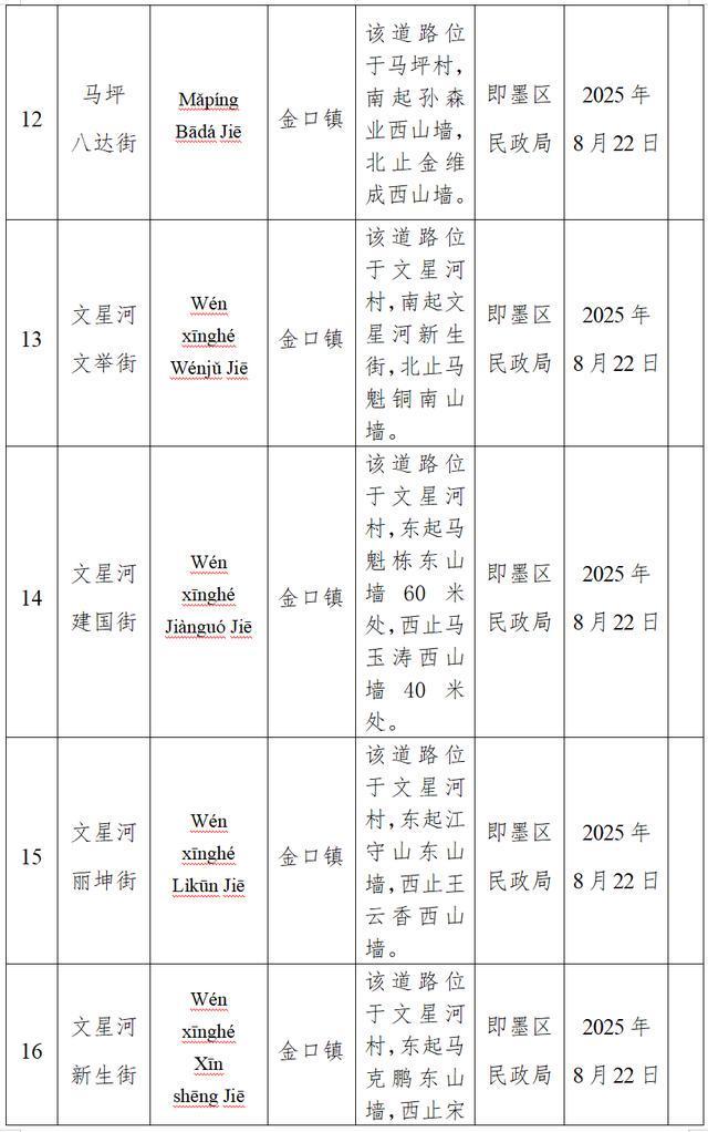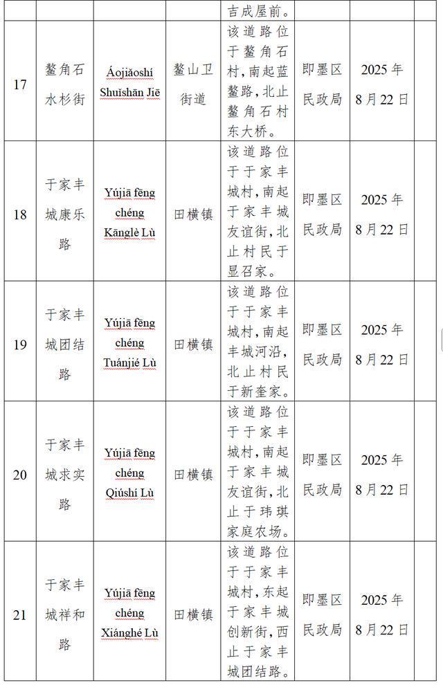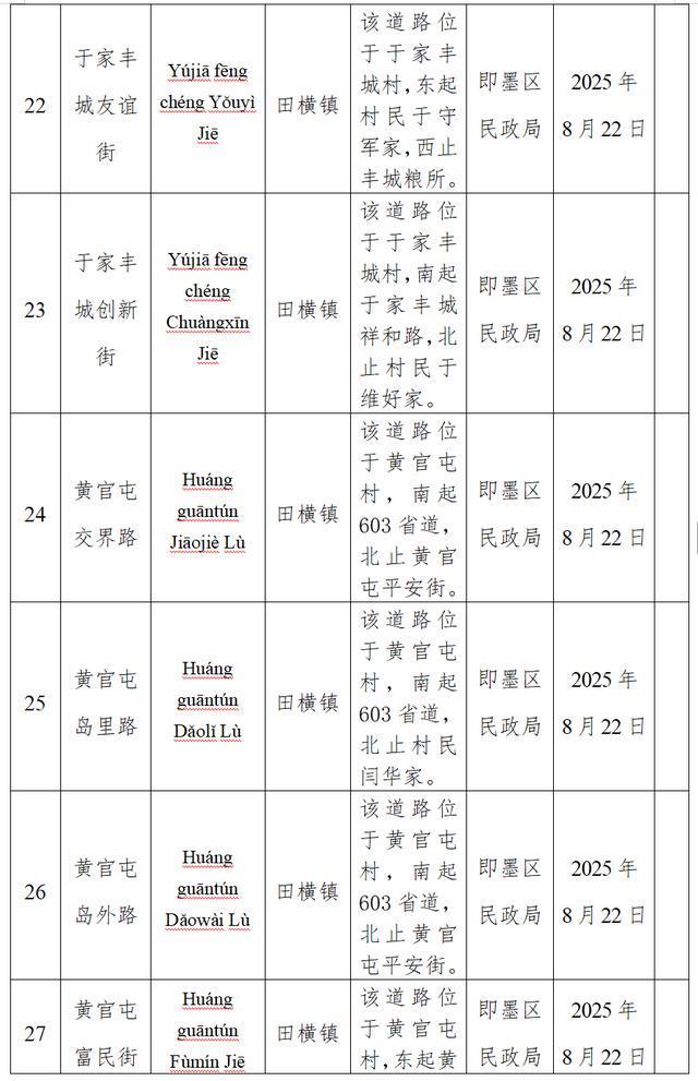 为助力乡村振兴和宜居宜业和美家园建设,根据《地名管理条例》和“乡村著名行动”要求,即墨区民政局批准对金口镇、田横镇、鳌山卫街道、温泉街道共35条乡村道路进行命名,现予以公告。