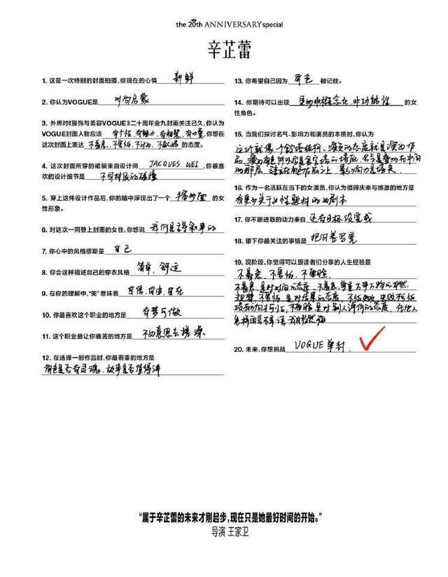 近日,辛芷蕾、刘亦菲、宋佳、杨幂等11位女演员共同登上《VOGUE》二十周年群封。她在问卷中写道:未来,自己想挑战VOGUE单封。