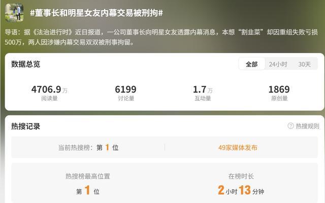 9月9日,#董事长和明星女友内幕交易被刑拘#的话题冲上微博热搜首位,且持续霸榜。