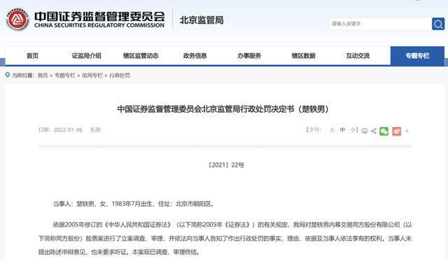 2022年1月,北京证监局曾披露一份行政处罚决定书,与上述案件内容高度吻合。当事人名为楚轶男,与科瑞天诚董事长郑某文日常联系频繁,关系非常密切。在知悉内幕信息后,楚轶男利用相关信托计划进行内幕交易。其中,楚轶男承认,购买聚鑫弘扬11号的资金来源是郑某文给予的买房资金。
