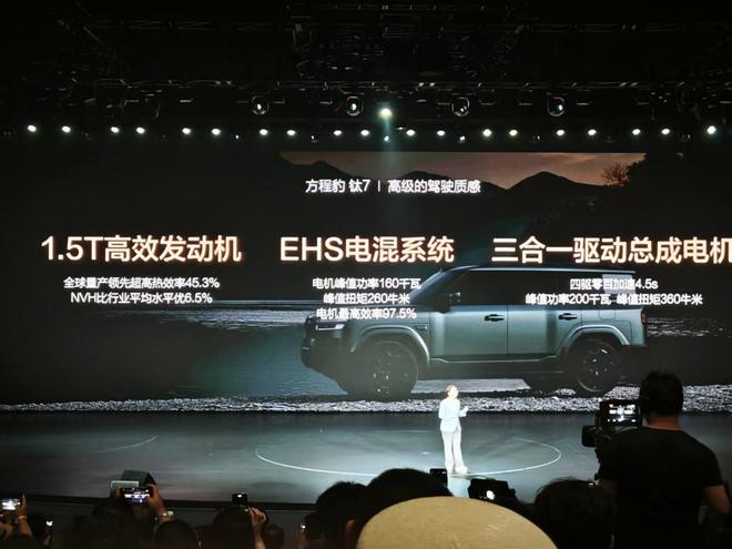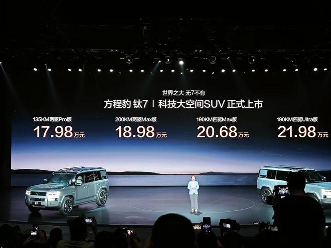 9月9日报道9月9日,方程豹钛7正式上市,新车推出135KM两驱Pro版、200KM两驱Max版、190KM四驱Max版、190KM四驱Ultra版共4个版本,售价17.98万元-21.98万元。作为方程豹首款承载式混动方盒子,也是钛系列的第二款车型,钛7定位科技大空间SUV,车长近5m,后备箱容积970L,二排放倒后可拓展至1880L。新车搭载新一代DM平台,采用1.5T发动机,四驱零百加速4.5s,配备云辇-C+主动预瞄,最小转弯半径5.67m。