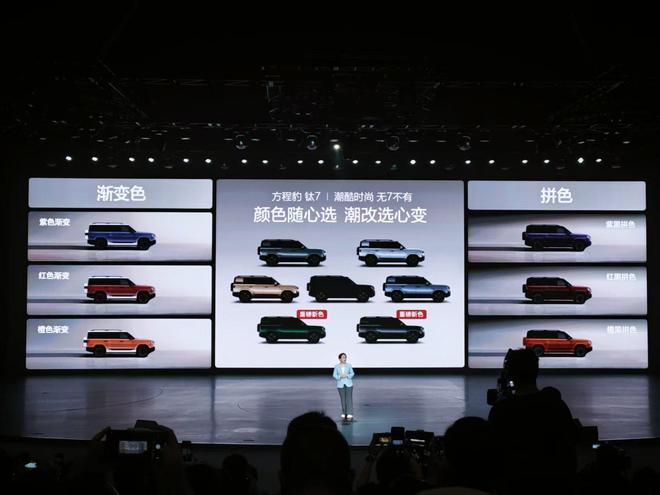 车身颜色方面,方程豹钛7提供山水绿、星月银、曜石黑、晨光蓝、旭日金等7款颜色,并且提供多款渐变色、拼色的潮改方案。