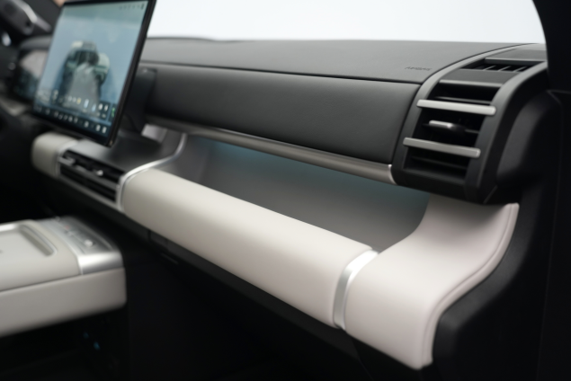 来到车内,钛7的内饰设计以简约大气为主,整体线条横平竖直,整个仪表台采用双层环绕悬浮式设计,搭载15.6英寸中控屏+12.3英寸仪表屏,以及16英寸W-HUD,副驾配有长方形凹槽储物空间。