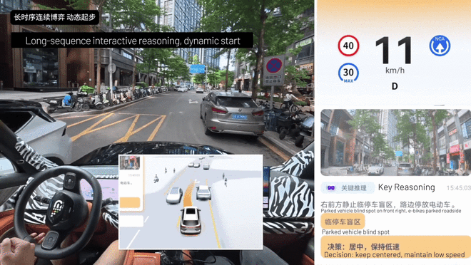 此外,VLA模型具备空间语义理解、异形障碍物识别、文字类引导牌解析、记忆语音控车等关键能力,可帮助驾驶员在大车遮挡、弯道盲区、复杂交汇口等高风险场景中进行预判应对,例如提前减速、智能绕行等操作,实现高度拟人化的“防御性驾驶”策略,进一步提升出行安全性。