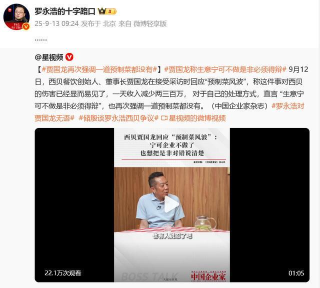 9月13日上午,罗永浩转发一则“西贝召开1.8万人罗永浩作战大会”的稿件截图,并评价:“西贝这些人没救了”“西贝真正的敌人不是我”。