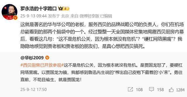 随后,他转发华与华营销咨询有限公司董事长华杉力挺西贝的微博内容回怼:这就是著名的华与华公司的老板,服务西贝的品牌战略公司的负责人,你们在机场总能看到的那两个脑袋中的一个。经过整整一天全国媒体密集地揭露西贝厨房内幕后,看看这几句:“这不是危机公关,因为根本就没有危机”?“硬杠网络黑嘴”?我隐隐地感觉到贾老板和贾老板的朋友们,是真心想把西贝搞死。