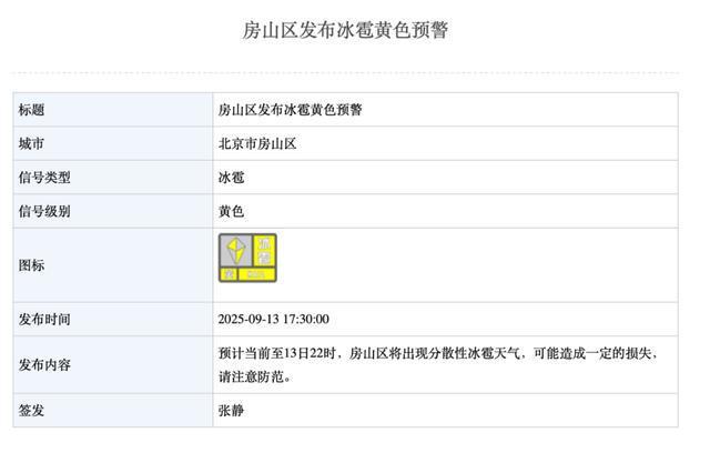 9月13日17时30分,房山区发布冰雹黄色预警,预计当前至13日22时,房山区将出现分散性冰雹天气,可能造成一定的损失,请注意防范。