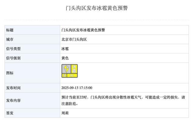 9月13日17时15分,门头沟区发布冰雹黄色预警,预计当前至22时,门头沟区将出现分散性冰雹天气,可能造成一定的损失,请注意防范。