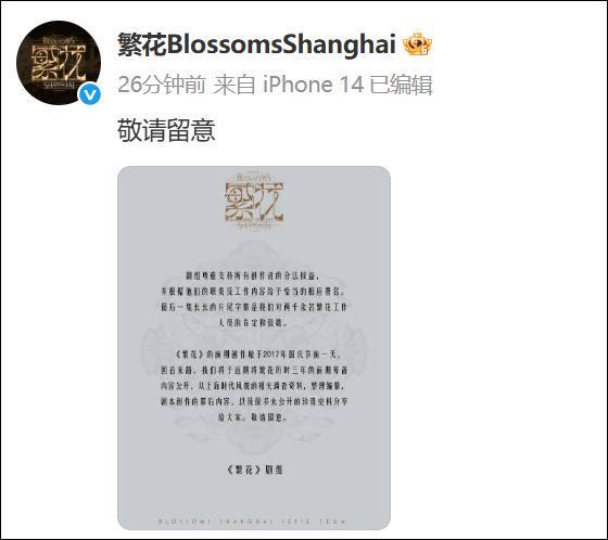 9月20日下午,电视剧《繁花》官方微博发文回应编剧署名权争议:“剧组支持所有创作者的合法权益,并根据职责和工作内容给予相应署名,最后一集长长的片尾字幕,是对两千余名工作人员的肯定和致敬”,呼吁大家敬请留意。
