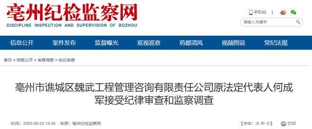 亳州市谯城区魏武工程管理咨询有限责任公司原法定代表人何成军涉嫌严重违纪违法,目前正接受亳州市谯城区纪委监委纪律审查和监察调查。(亳州市谯城区纪委监委)