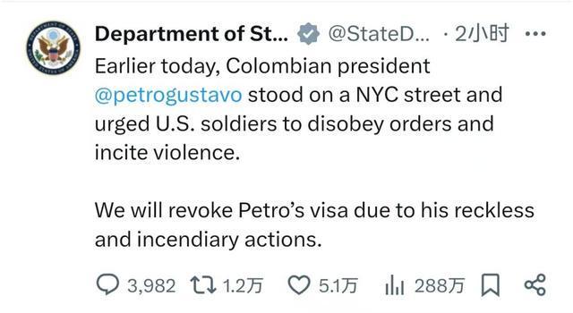 帖文写道:“由于佩特罗的鲁莽和煽动行为,我们将吊销他的签证。”