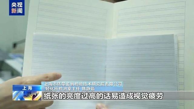 上海市质量监督检验技术研究院有限公司轻化所检测室主任 陈静茹:小朋友在做作业的过程中,纸张的亮度过高,易造成视觉疲劳,对眼睛的刺激比较大,长期接触对视力是有不利影响。