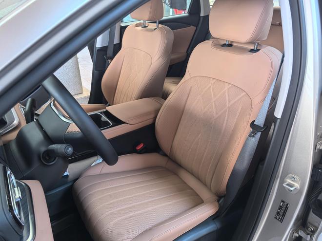 中控台设计很简洁,保留了必要的物理旋钮。空调出风口用了“涟漪回纹”的设计,不影响功能,看着美感。门板、座椅等位置还有精致的绗缝,细节收得干净,不浮夸。