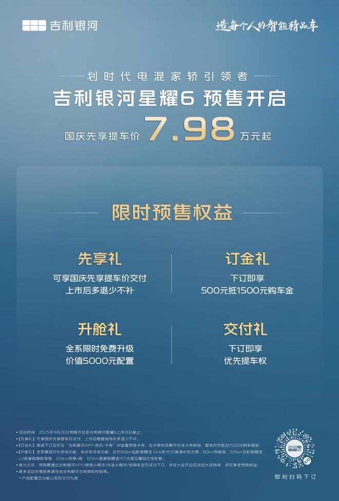 吉利银河星耀6预售价公布,起售价为7.98万元,消费者可在国庆期间提车,这款车型以其优秀的性价比和卓越的性能表现吸引了众多消费者的关注,吉利银河星耀6的预售开启,为消费者提供了一个选择高品质、实惠的汽车的机会。