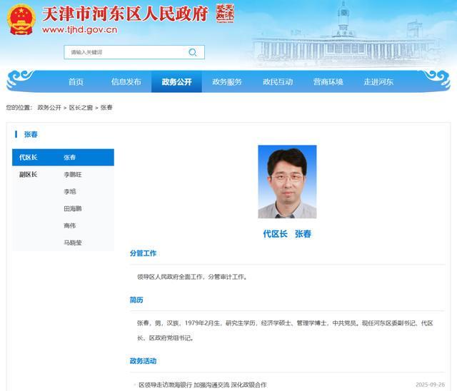 上述消息显示,张春已任天津市河东区代区长。