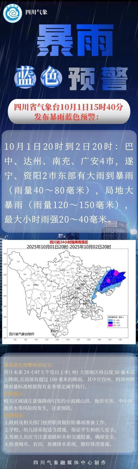 10月1日20时到2日20时:巴中、达州、南充、广安4市,遂宁、资阳2市东部有大雨到暴雨(雨量40~80毫米),局地大暴雨(雨量120~150毫米),最大小时雨强20~40毫米。