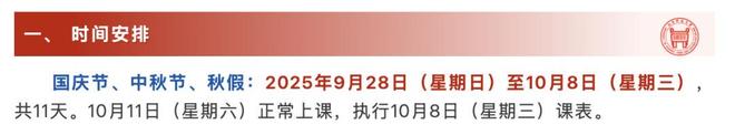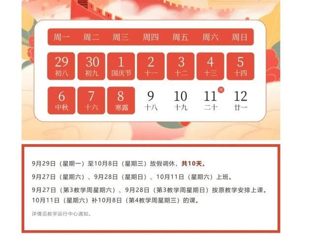 其通知称,9月29日至10月8日放假调休,共10天。9月27日(第3教学周星期六)、9月28日(第3教学周星期日)按原教学安排上课。10月11日(星期六)补10月8日(第4教学周星期三)的课。
