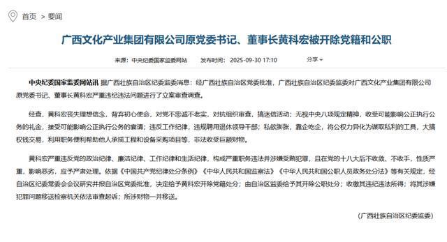 中央纪委国家监委网站讯 据广西壮族自治区纪委监委消息:经广西壮族自治区党委批准,广西壮族自治区纪委监委对广西文化产业集团有限公司原党委书记、董事长黄科宏严重违纪违法问题进行了立案审查调查。