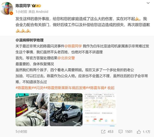 陈震转发贴文并道歉:发生这样的意外事故,给您和您的家庭造成了这么大的伤害,实在对不起,我会全力配合有关部门,做好后续工作以及补偿给您这边造成的损失,再次跟您道歉。