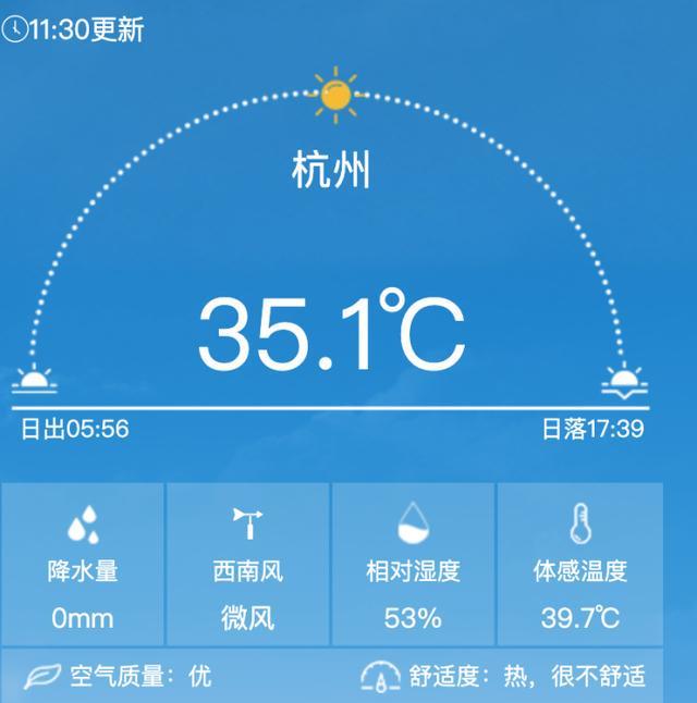 据中央气象台消息,今天中午12时不到,杭州主城区气温已经突破35℃高温线,由于湿度高,体感温度已经接近40℃(39.7℃),天气小姐姐再次提醒大家一定要做好防暑防晒工作,千万不要倒在秋天的门槛前。