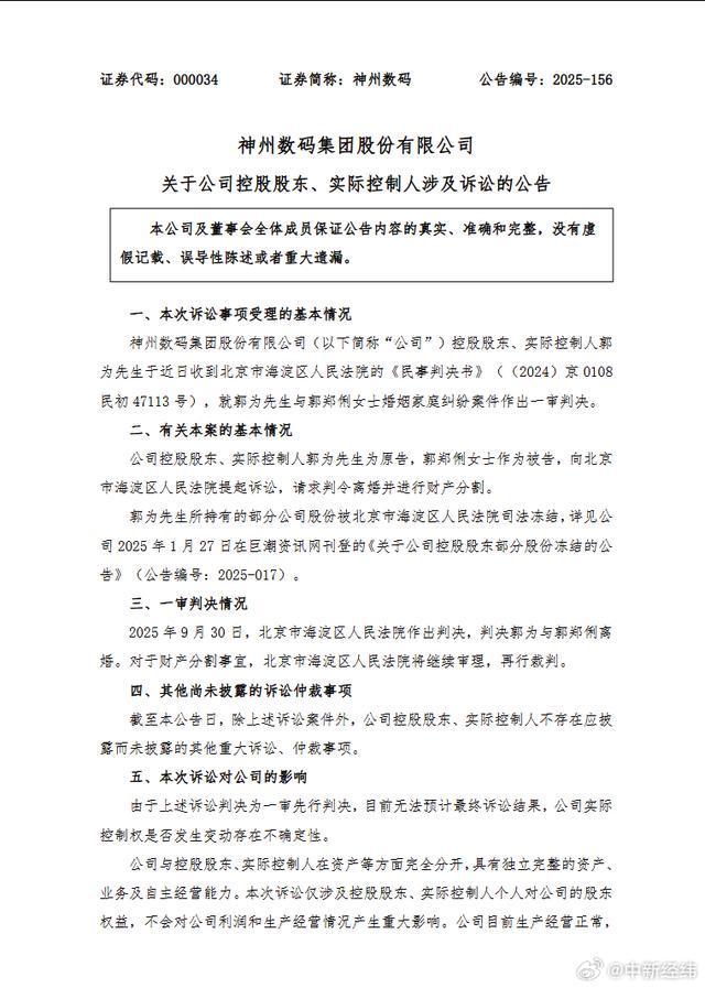10月10日,神州数码公告,控股股东、实际控制人郭为涉及的婚姻家庭纠纷案件于2025年9月30日作出一审判决,判决其与郭郑俐离婚。而对于财产分割事宜,法院将继续审理,再行裁判。