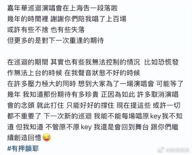 他还称:“我能不能每场唱原key我不知道,但我知道,不管原不原key,我还是会回到舞台,跟你们继续创造回忆。”