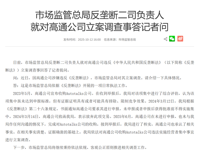 2023年5月,高通公司宣布收购Autotalks公司。在收到举报后,我局对该项集中进行了综合评估,认为该项集中虽未达到申报标准,但有证据证明具有或者可能具有排除、限制竞争效果。2024年3月12日,我局根据《反垄断法》第二十六条规定,书面通知高通公司要求其进行申报,未申报或者申报后获得批准前不得实施集中。2024年3月14日,高通公司致函我局,表示放弃此项交易。2025年6月,高通公司在未进行申报、也未与我局作任何沟通的情况下,完成对Autotalks公司的收购。接到举报后,我局进行了核实,高通公司也承认了相关事实。在相关事实清楚、证据确凿的基础上,我局依法对高通公司收购Autotalks公司违法实施经营者集中事宜进行立案调查。