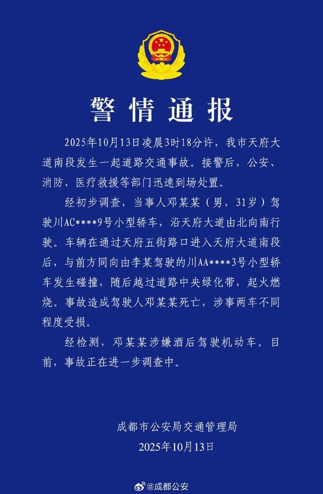 经初步调查,当事人邓某某(男,31岁)驾驶川AC****9号小型轿车,沿天府大道由北向南行驶。车辆在通过天府五街路口进入天府大道南段后,与前方同向由李某驾驶的川AA****3号小型轿车发生碰撞,随后越过道路中央绿化带,起火燃烧。事故造成驾驶人邓某某死亡,涉事两车不同程度受损。