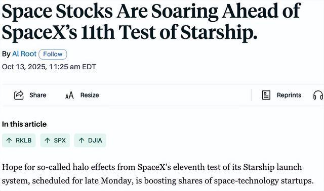 △美国知名财经杂志《巴伦周刊》报道,“星舰”第11次试飞前,太空股飙升