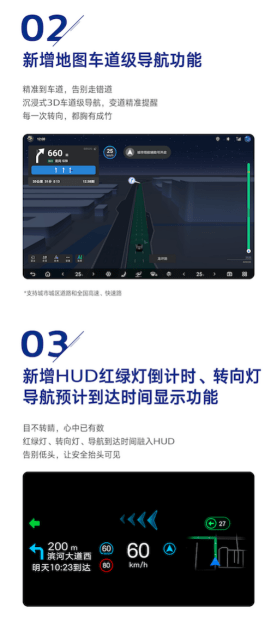 其次导航体验上,新增地图车道级导航功能,能够将导航指令升级为沉浸式的3D车道级精准指引,同时新增HUD红绿灯倒计时、转向灯、导航预计到达时间功能显示。让用户的架势更加轻松专注,避免行车路线选择错误。