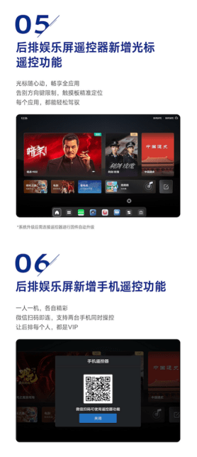 另外,后排娱乐屏遥控器新增光标遥控功能预手机遥控功能,光标遥控支持触摸板精准定位,摆脱方向键操作限制;手机遥控则可以通过微信扫码链接,支持两台手机同时操控,让后排乘客操作更加灵活便捷。