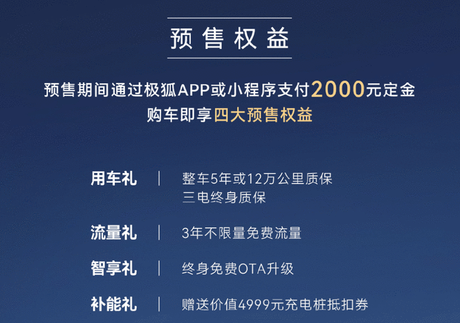 即日起通过极狐APP或小程序支付2000元定金,购车可以享受整车5年或12万公里质保、三电终身质保、3年免费不限量数据流量、终身免费OTA升级、价值4999元充电桩安装抵扣券等四重礼遇。