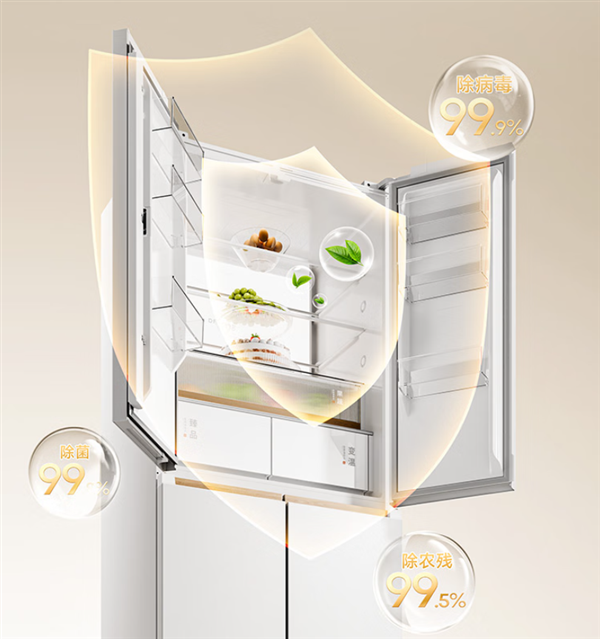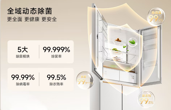 其搭载升级款全域动态除菌系统,融合紫外线、活性氧与负离子等五效消杀净化技术,经权威检测除菌率高达99.999%,病毒灭活率超99.9%,农残去除率达99.5%。