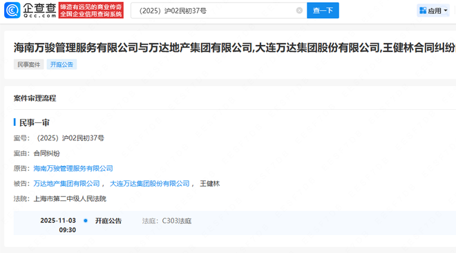 企查查APP显示,近日,法院公开海南万骏管理服务有限公司起诉大连万达集团股份有限公司、万达地产集团有限公司、王健林合同纠纷案件开庭信息。公告显示,该案件计划将于11月3日在上海市第二中级人民法院开庭审理。