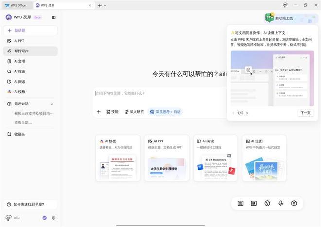 内置的AI写作助手能够一键生成各种稿件、表格、PPt等内容,高效解决学习与职场的应急需求。