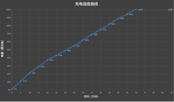 5分钟充电11%,10分钟充至21,20分钟充至37%,半小时充至49%。UI充满1小时10分钟,停止充电1小时30分钟。涓流充电的电量大约占据电池的4%。