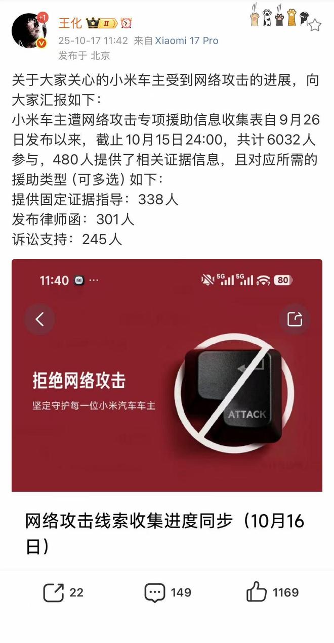 小米集团公关部总经理王化发布关于小米车主受到网络攻击的进展: