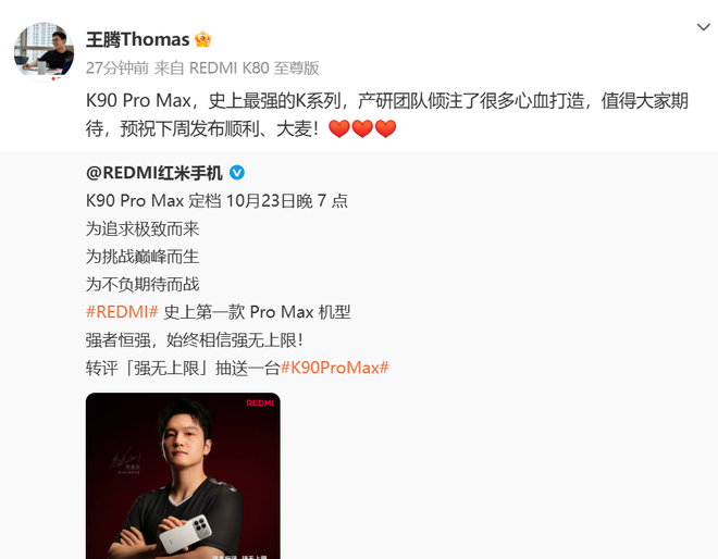 10月17日,王腾转发红米手机官网微博并祝大卖:“K90 Pro Max,史上最强的K系列,产研团队倾注了很多心血打造,值得大家期待,预祝下周发布顺利、大麦!”