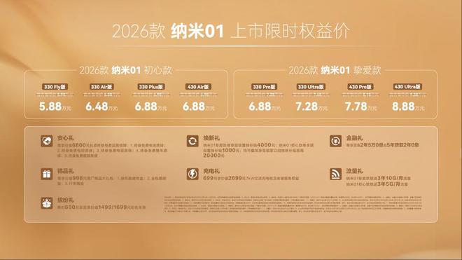 动力方面,2026款纳米01采用前置单电机驱动,最大功率70kW,峰值扭矩160N·m,最高车速为140km/h。新车配备超级快充功能,30%-80%电量直流快充时间为30分钟,充电8分钟可补充200km续航。搭载31.45kWh电池的车型CLTC续航里程为330km,搭载42.3kWh电池的车型CLTC续航里程为430km。此外,新车还将支持外放电功能。