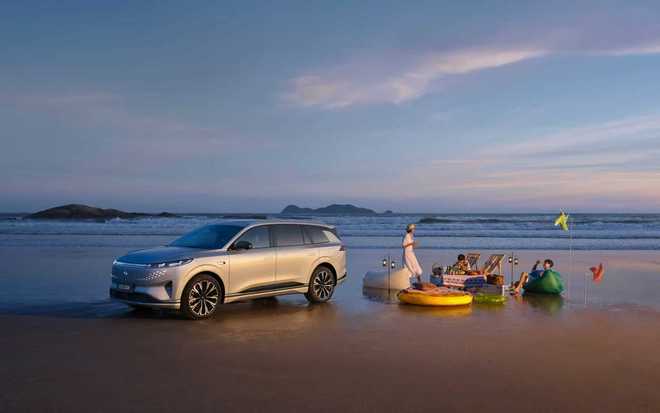 车尾则采用贯穿式的尾灯设计,点阵式的光源布局,点亮后科技感十足,提升整台车的辨识度。整车的风阻系数0.268。插电混动版车型采用低风阻造型轮圈,而纯电动版车型则采用7辐式轮圈,并配备侧视摄像头。